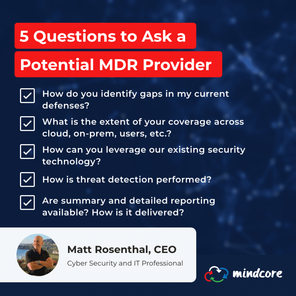 As we know, MDR services can vary greatly across the market and there is no one-size-fits-all solution — it depends on your organization’s unique security needs and goals. However, during the evaluation process, there are specific questions you should ask to qualify or disqualify a potential vendor from consideration. Here are 5 questions to help you determine their ability to meet your Managed Detection and Response requirements.