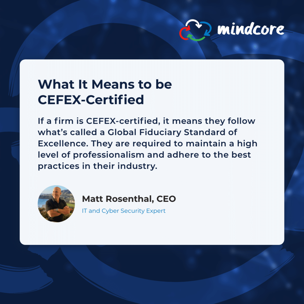 Some organizations oversee financial advisors and various certifications one might acquire. A CEFEX certification is one way to determine whether your advisor operates by a certain set of standards. If a firm is CEFEX-certified, it means they follow what’s called a Global Fiduciary Standard of Excellence. They are required to maintain a high level of professionalism and adhere to the best practices in their industry.