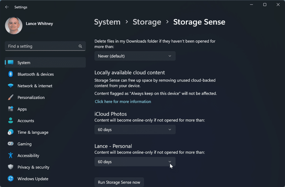 Storage Sense allows you to have control over how it operates. For instance, you can choose: